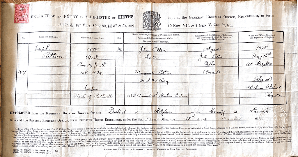 Joseph Patton was born on 24 April 1878, in Carfin in the Parish of Bothwell, son of John Patton and Margaret Patton (née McRory), who had married in Stranolar, Ireland, in 1862.